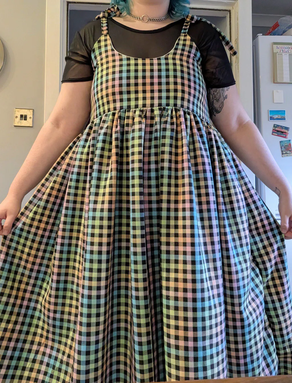 Ordered this dress in the rainbow pastel gingham and I’m in loooove!! It fits me perfectly. It’s so comfy, and has pockets which is always a win!